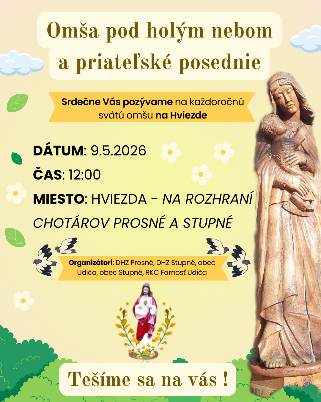 DHZ Prosné, DHZ Stupné, obec Udiča, obec Stupné a RKC Farnosť Udiča pozývajú všetkých občanov na Omšu pod holým nebom a priateľské posedenie, ktorá sa bude konať dňa 09.05.2026 (t.j. v sobotu) v čas od 12.00 hod. na HVIEZDE – rozhranie chotárov Prosné a Stupné. Všetci sú srdečne vítaní.